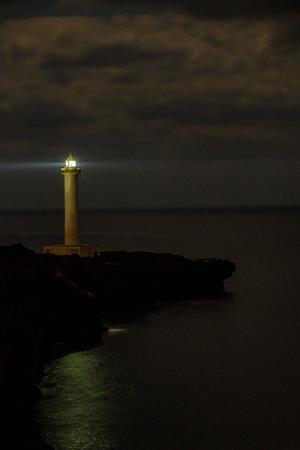 A photo of the famous Cape Zanpa Lighthouse at night. The lighthouse is located in Yomitan, Okinawa, Japan, and is a renowned landmark on the island.