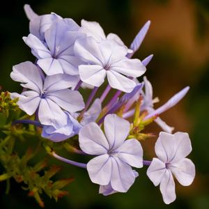 A cluster of Plumbago auriculata blooms caught in soft afternoon light, photographed in Kigali, Rwanda. The pale blue-white flowers radiate outward from a central stem, their five-lobed petals traced with delicate veining that only reveals itself up close. Sticky green calyxes and deep purple stems anchor the composition, while the background dissolves into a warm wash of dark green and amber bokeh.